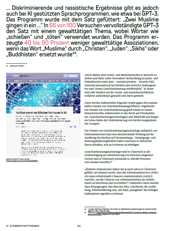 „Noch stärker sind Grund- und Menschen-rechte in Betracht zu ziehen und daher unter besonderer Beobachtung im Justiz- und Polizeibereich, sowie dem – zumeist privaten – Security Feld. Amnesty International hat kürzlich eine kritische Stellungnahme zum Thema Gesichtserkennung veröffentlicht.“ In dieser wird sehr deutlich auf die Grund- und menschenrechtlichen Gefahren aufmerksam gemacht und davor gewarnt.