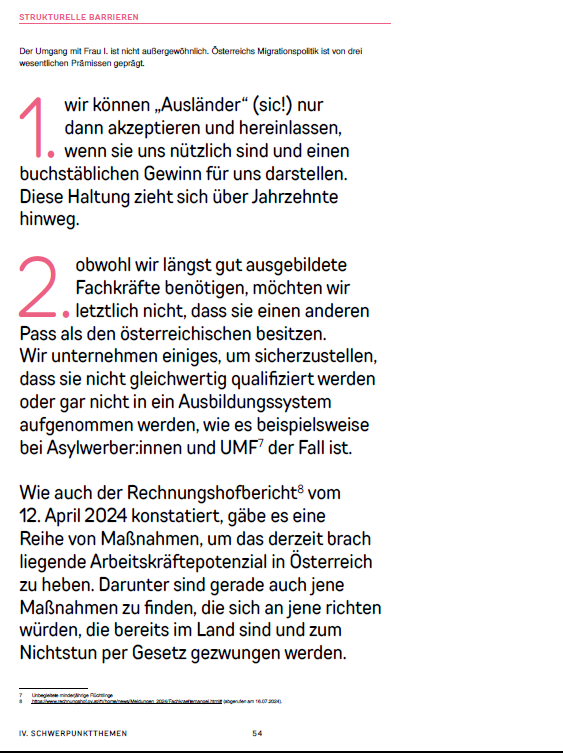 Zweitens, obwohl wir längst gut ausgebildete Fachkräfte brauchen, wollen wir letztlich nicht, dass sie einen anderen Pass, als den Österreichischen haben und tun so einiges, um sie zu dequalifizieren oder gar nicht in ein Ausbildungssystem rein zu lassen; wie etwa bei Asylwerber*innen und UMF´s[7].