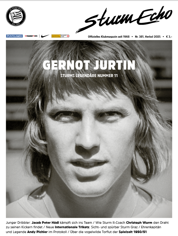 In der Schwerpunkt Nummer 381 des Sturm Echo dreht sich alles um den legendären Sturm Bomber Gernot Jurtin. Aber auch Andi Pichler, Ehrenkapitän des Sk Sturms und Mitglied des Legendenklubs kam zu Wort. Gemeinsam blickten wir anläßlich seines 70er gemeinsam zurück und auf die Freundschaft mit Gernot Jurtin, der – wenn er noch unter uns weilen würde – ebenfalls im Herbst 2025 70 Jahre geworden wäre.