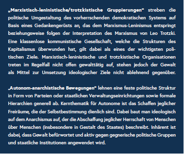 „In einer Gesamtbetrachtung stellt der Linksextremismus gegenwärtig keine ernsthafte Gefahr für die Funktions- und Handlungsfähigkeit des Staates dar. Für die öffentliche Ruhe, Ordnung und Sicherheit sind Teilbereiche des linksextremen Spektrums jedoch weiterhin als Risiko zu bewerten.[3]