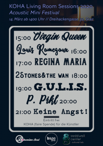 Wie schon letztes Jahr organisieren wir auch heuer wieder gemeinsam mit Art Base eine akustic-unplugged Living Room Session im Seddwell Center, mit vielen lieben Freund*innen gemeinsam. Alles natur, unverstärkt und akustisch. Zart und intensiv, laut mit Emotionen und klar.