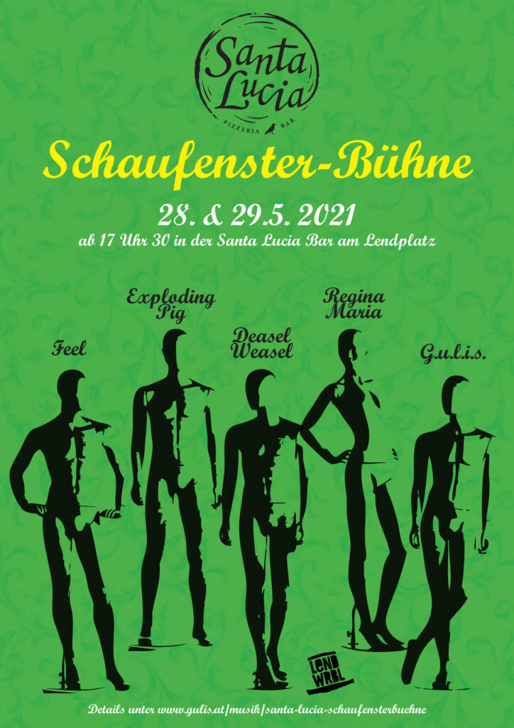 Die schon traditionelle Santa Lucia Bühne am Lendplatz Süd – letztes Jahr wegen Lockdown ersatzlos gestrichen – wird 2021 zumindest als reduziertes Schaufensterkonzert abgehalten, in und vor der Santa Lucia Bar/Stockergasse. Die Musiker*innen drinnen, die Leute draussen, mit den entsprechenden Regeln und Vorsichtsmaßnahmen. Aber ihr kennt das ja eh schon.