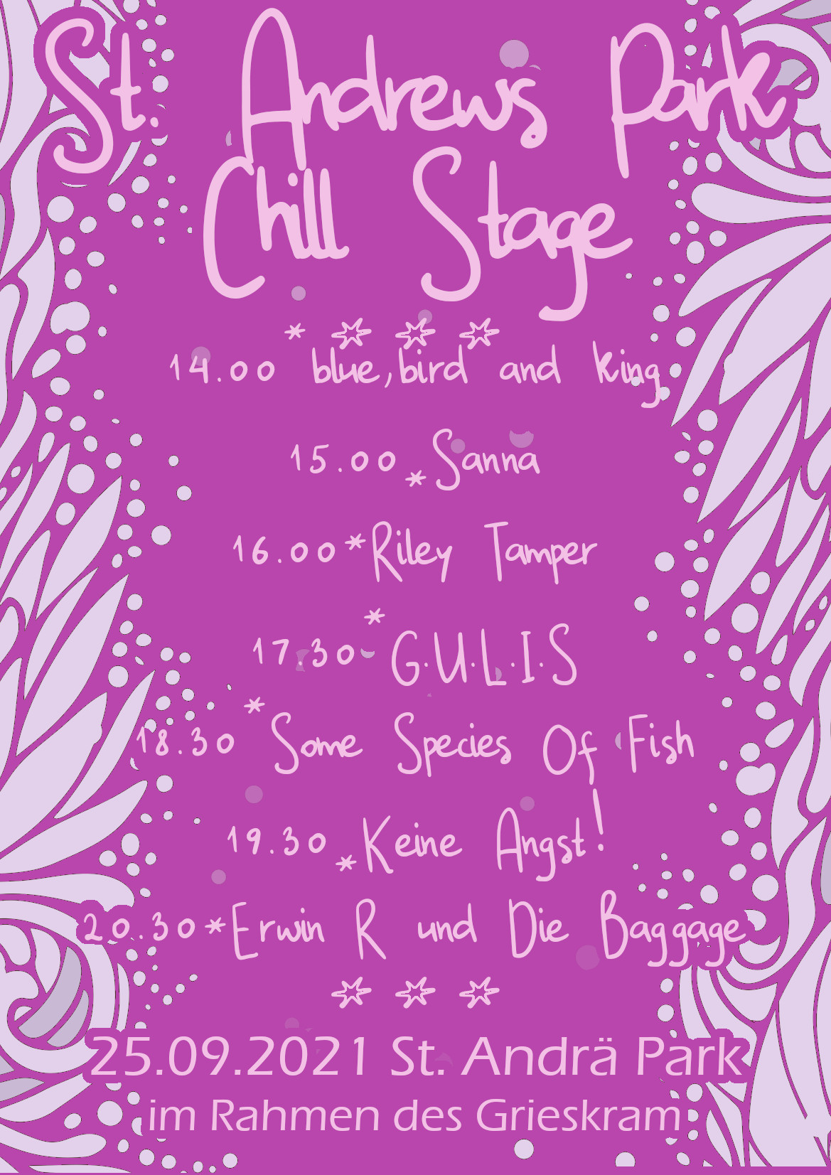 Der Grieskram 2021 findet statt. Das ist die gute Nachricht. Die St. Andrews Park Chill Stage – fast schon eine Institution ist wieder mit dabei. In voller Pracht und Herrlichkeit. Nichtsdestotrotz gibt es die 3-G Regel, Registrierung und Zugangskontrollen. Aber mit Eurer Achtsamkeit und Mithilfe wird das Projekt gelingen.