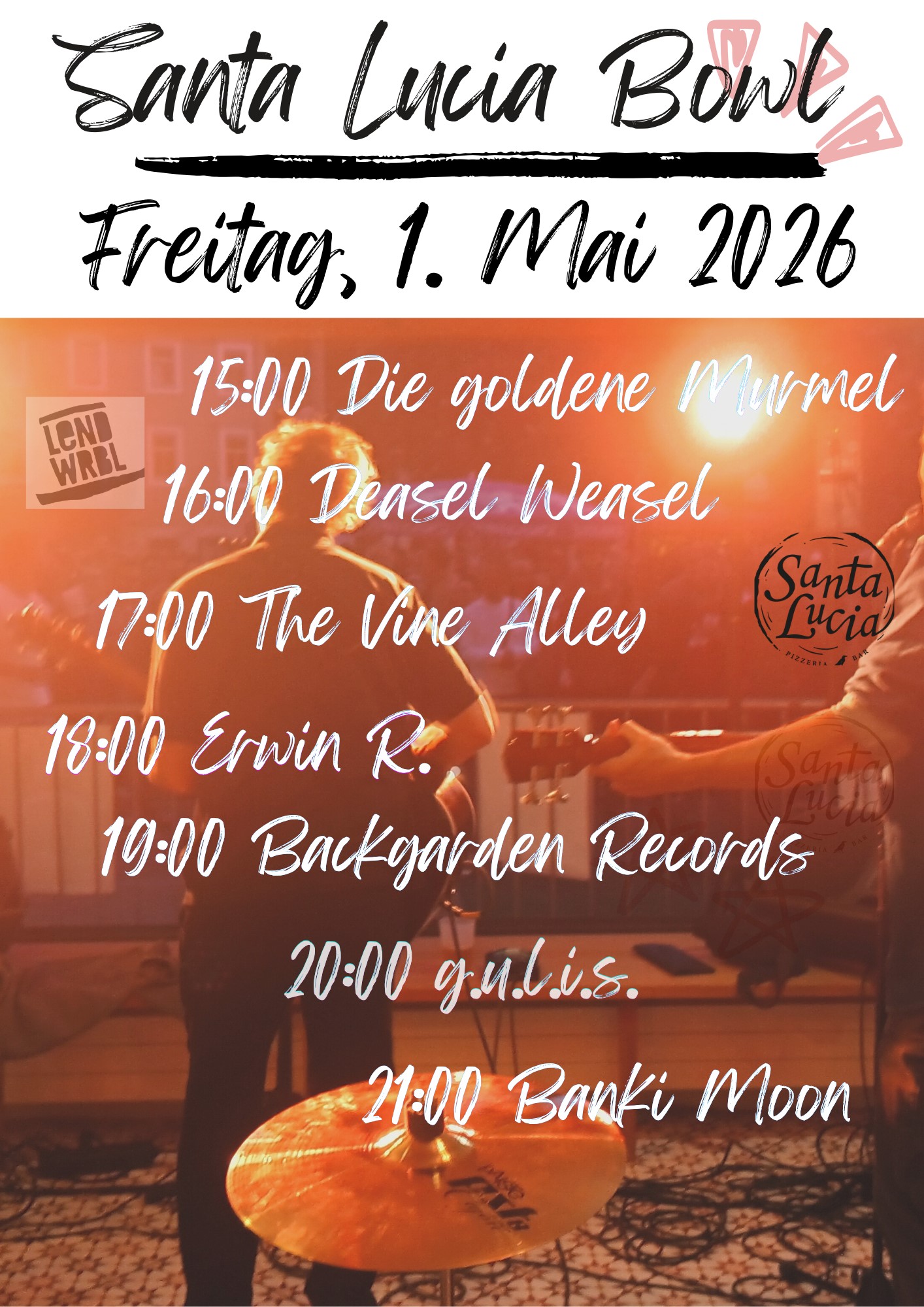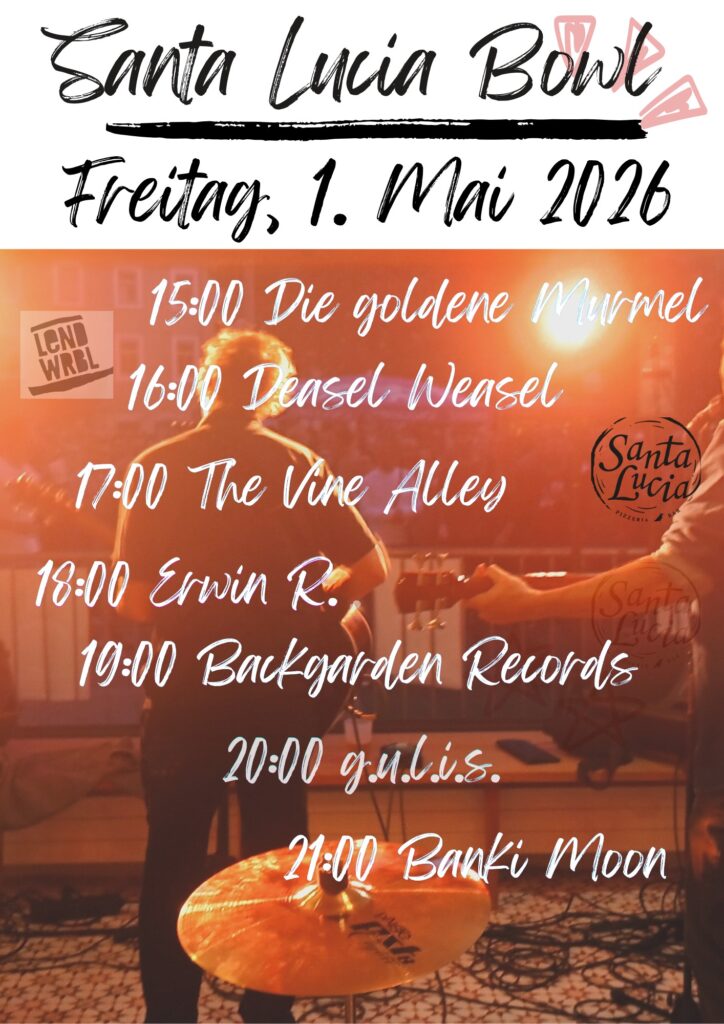 Geschätzte Freund*innen, das Santa Lucia Team beehrt sich bekannt zu geben, dass auch 2026 im Rahmen des Lendwirbels der Spielort der Pizzeria Santa Lucia am Freitag, den 1. Mai ab 15 Uhr zur Anwendung kommt. Mit herausragenden Musiker*innen wird das Ereignis denkwürdig gestaltet werden. Adäquates Erscheinen und Benehmen, wird vorausgesetzt und Bargeld sollten Sie dabei haben, damit Sie ihrer Freude pekunären Ausdruck verleihen können.